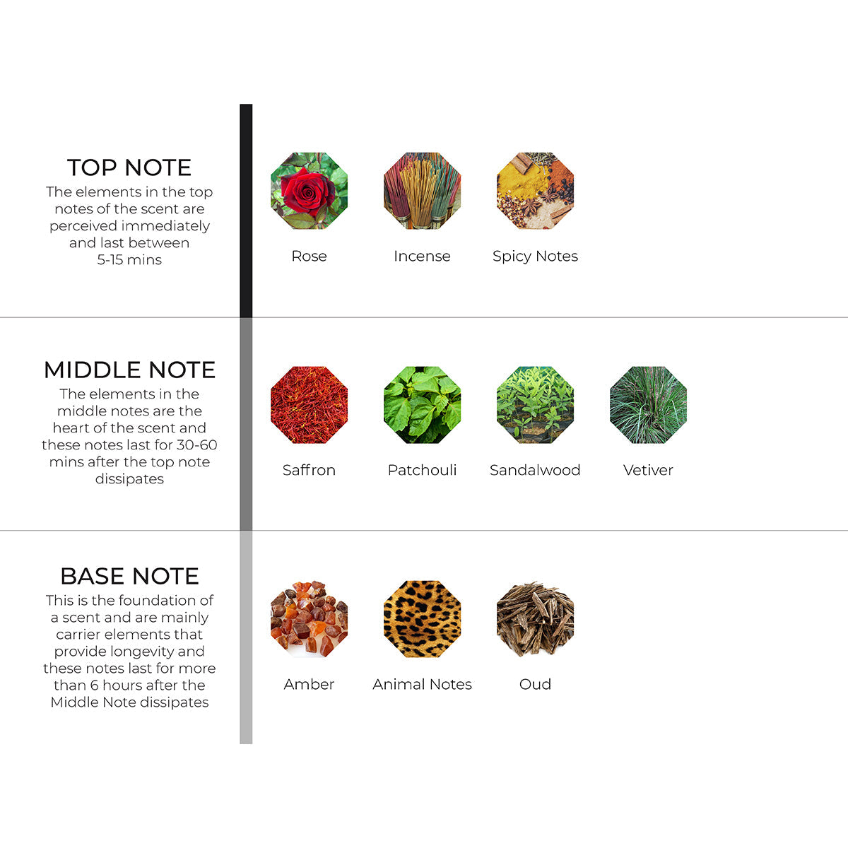 Oud Regal evokes a powerful and enchanting Middle Eastern ambiance. This scent embodies a delicate and graceful combination of rose and oud, exuding a sense of refinement. The composition is expertly crafted, beginning with a comforting oud note that gradually intertwines with saffron, adding a touch of culinary allure and lending a dusky allure to the scent. As it evolves, the fragrance transforms with the emergence of patchouli, accompanied by gentle caresses of sandalwood, disrupting the linear progression and achieving a harmonious balance.
