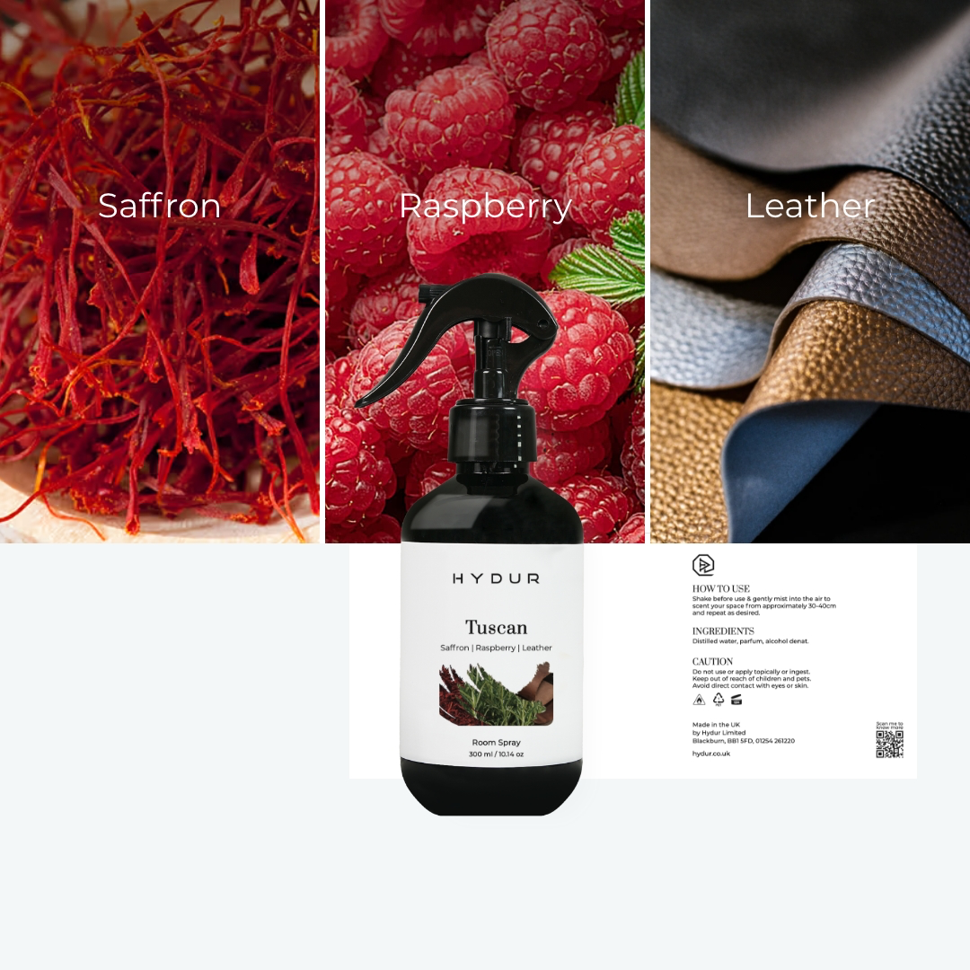 Tuscan is a bold and luxurious Room spray, blending the rich spice of saffron with the juicy sweetness of raspberry. Deep, smoky leather adds a sensual and refined intensity, creating a scent that is both powerful and irresistibly sophisticated.